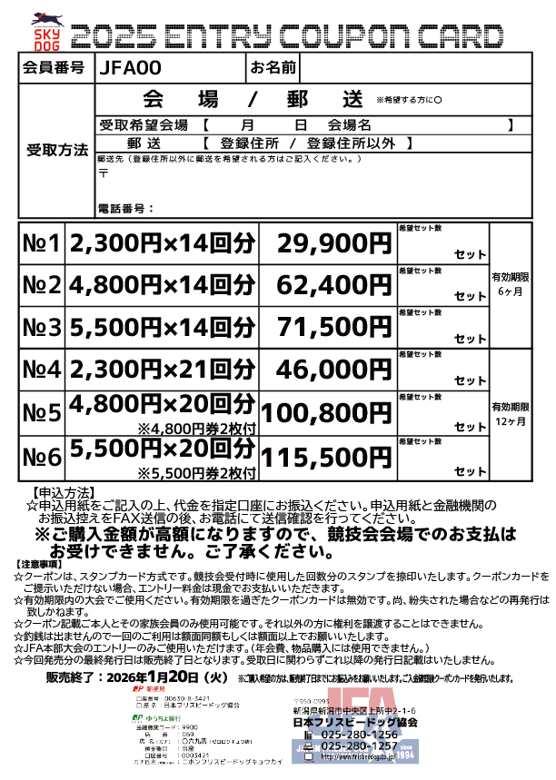 特に記載がなければお振込み確認後、準備が整い次第直近での会場でのお渡しとなります。(入金確認、発行には多少の時間を頂戴いたしますので、お急ぎの方は受取希望会場締切日時までにお申込み・お振込みを完了してください。